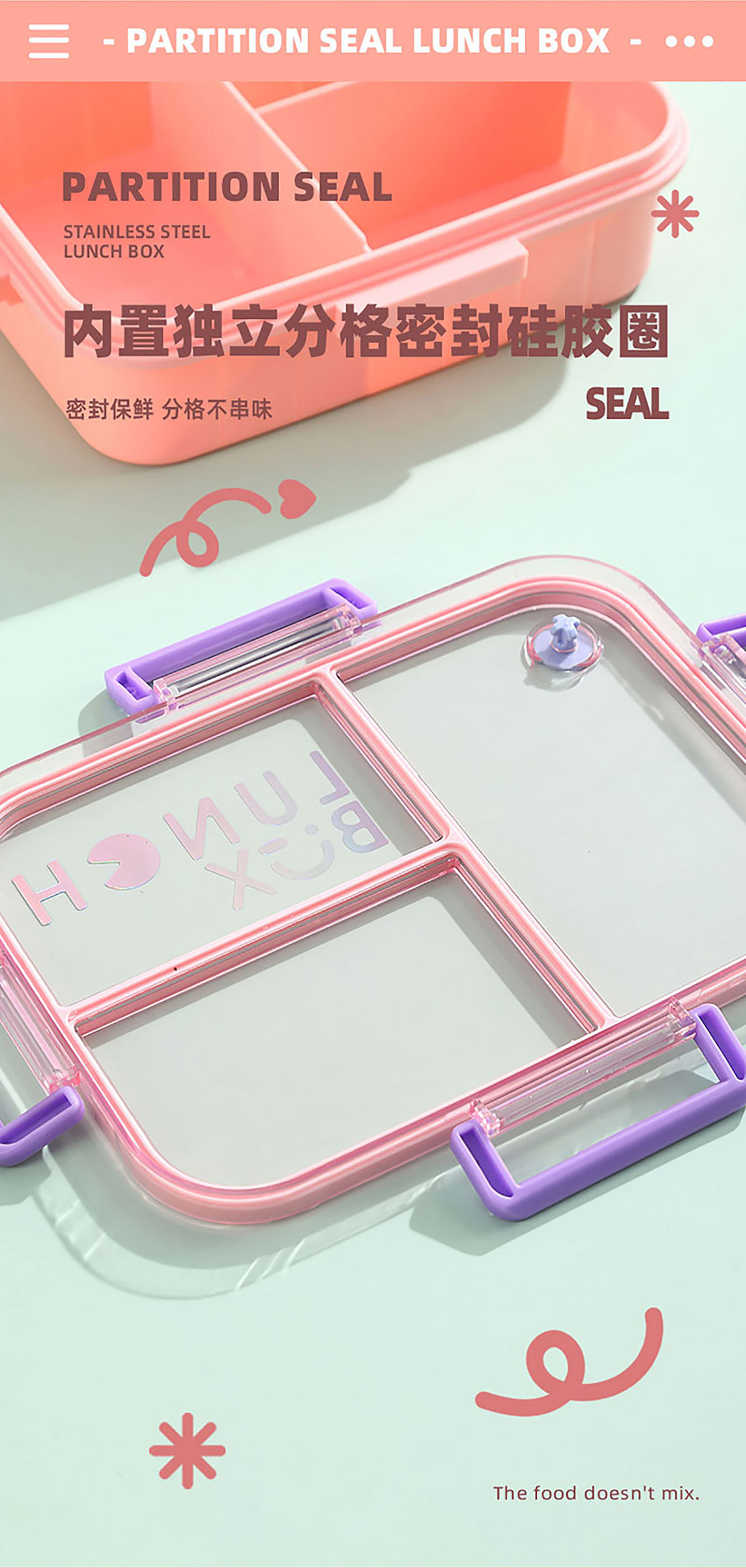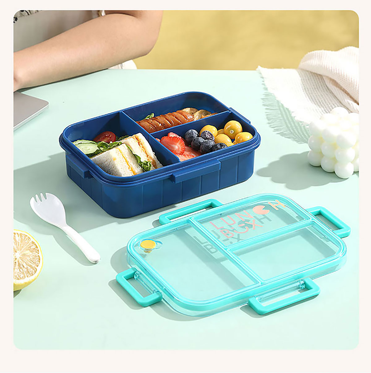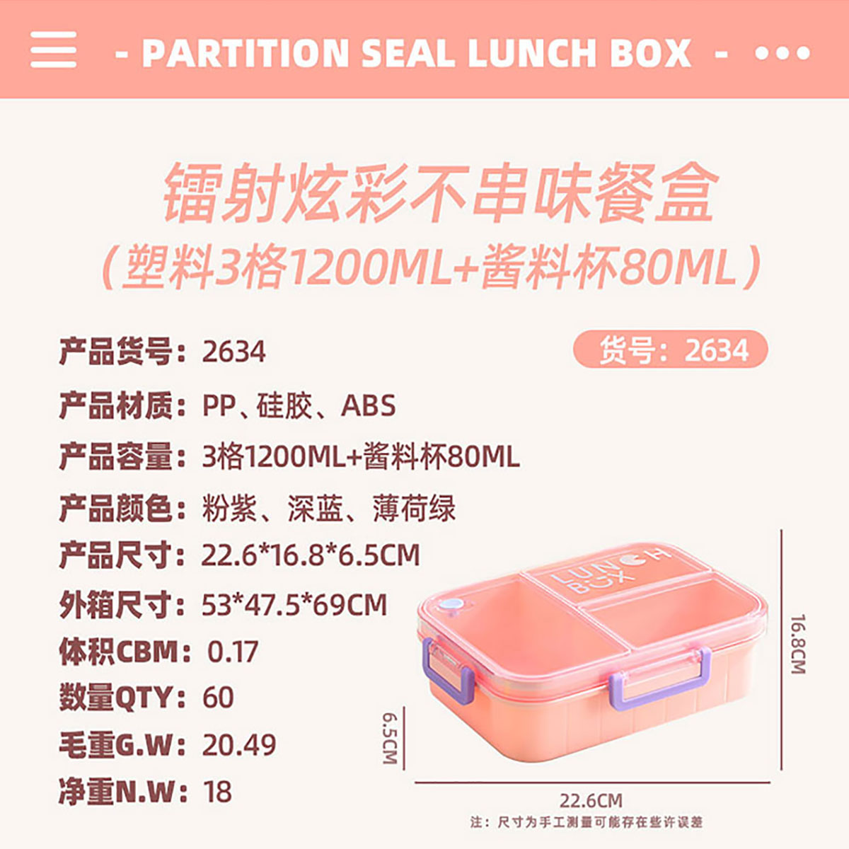 Size: AQX-2633:226*168*65mm/塑料2格1200ml+醬料杯80ml AQX-2634:226*168*65mm/塑料3格1200ml+醬料杯80ml