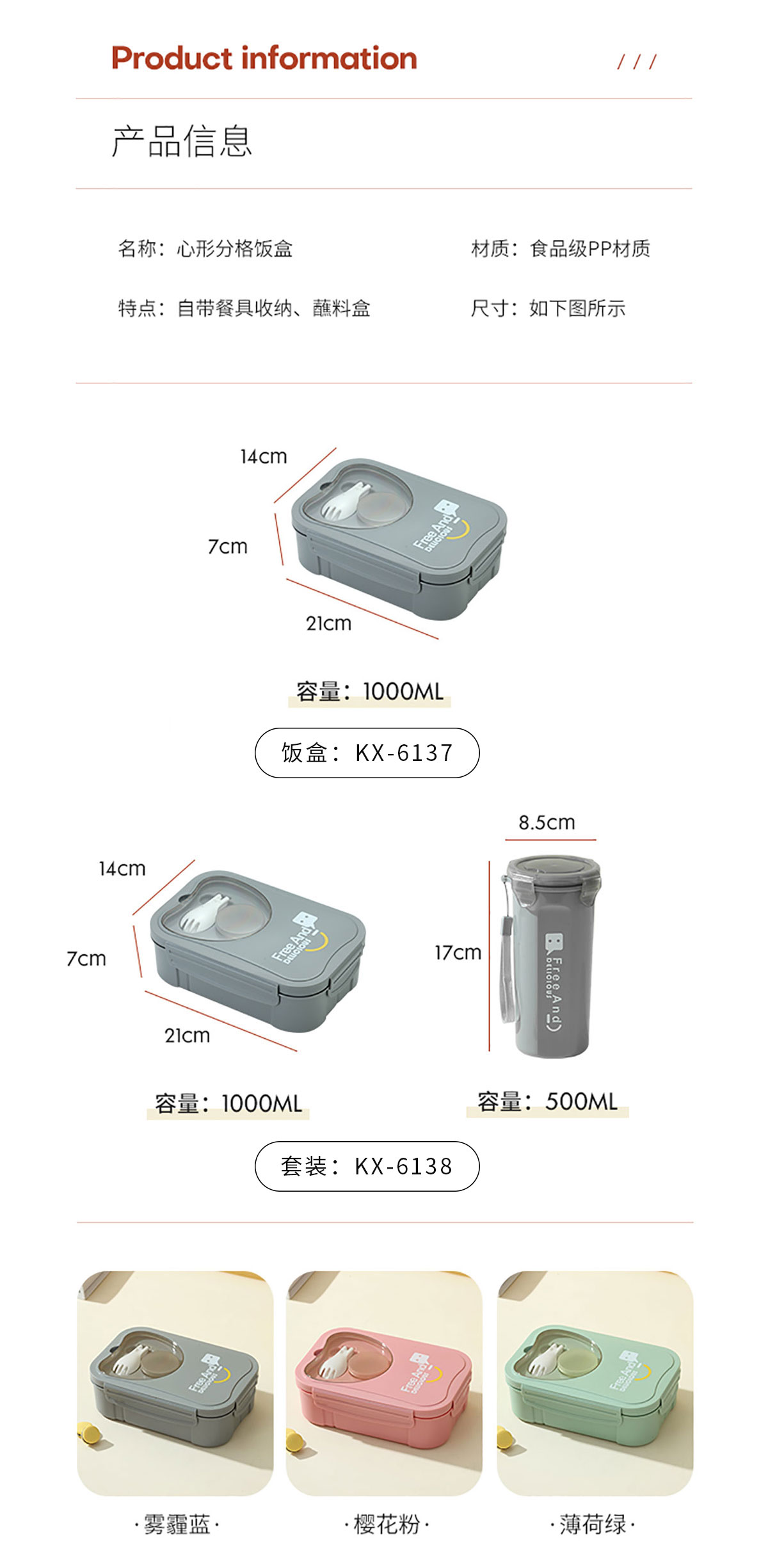 Size: KX-6137:210*140*70mm/1000ml KX-6138:飯盒:210*140*70mm/1000ml 水壺:Φ85*170mm/500ml