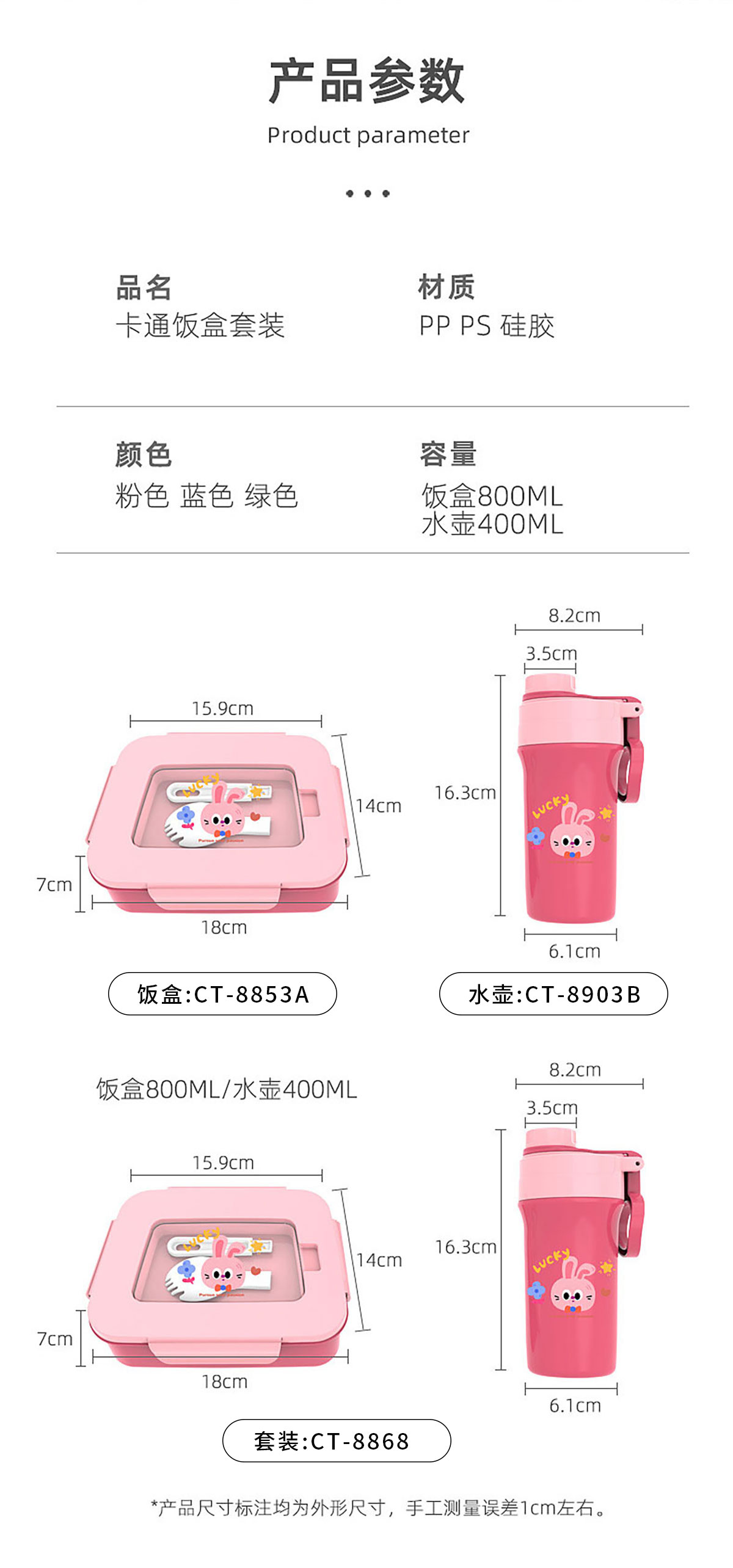 CT-8868(飯盒水壺套裝):飯盒:180*140*70mm 水壺:φ82*163mm