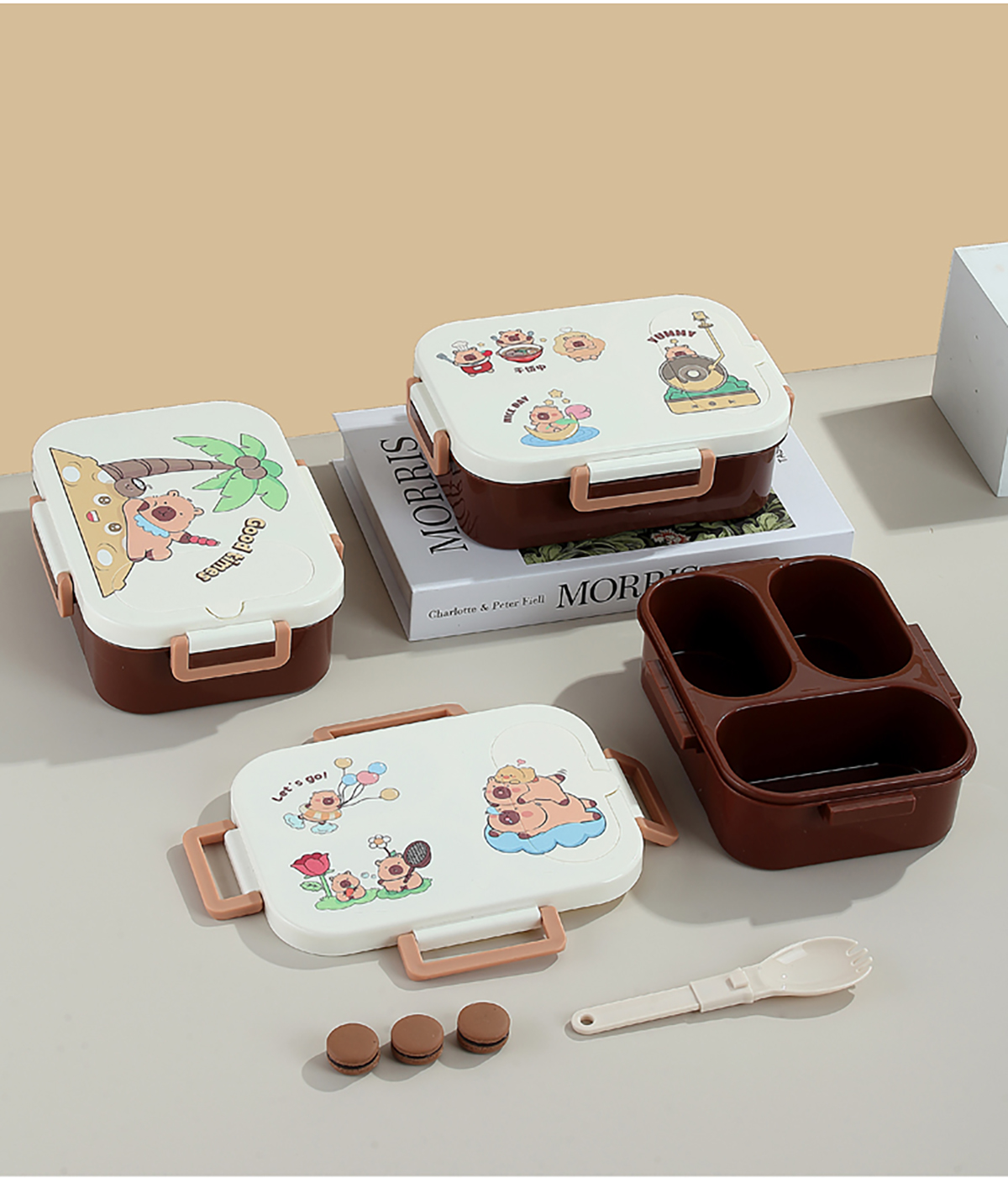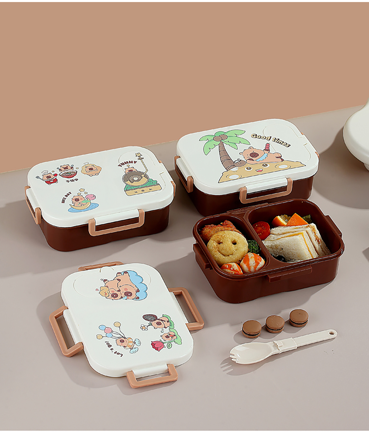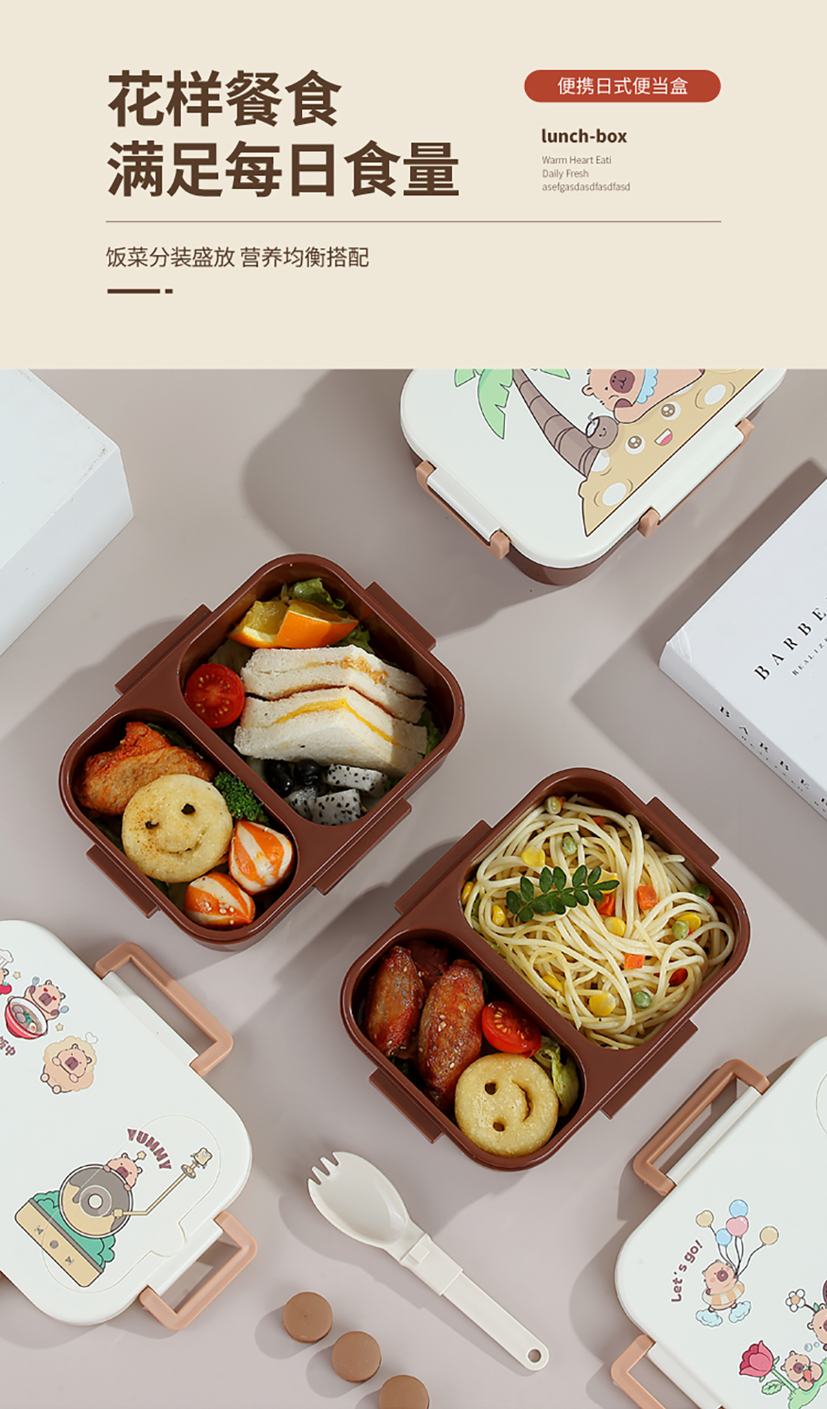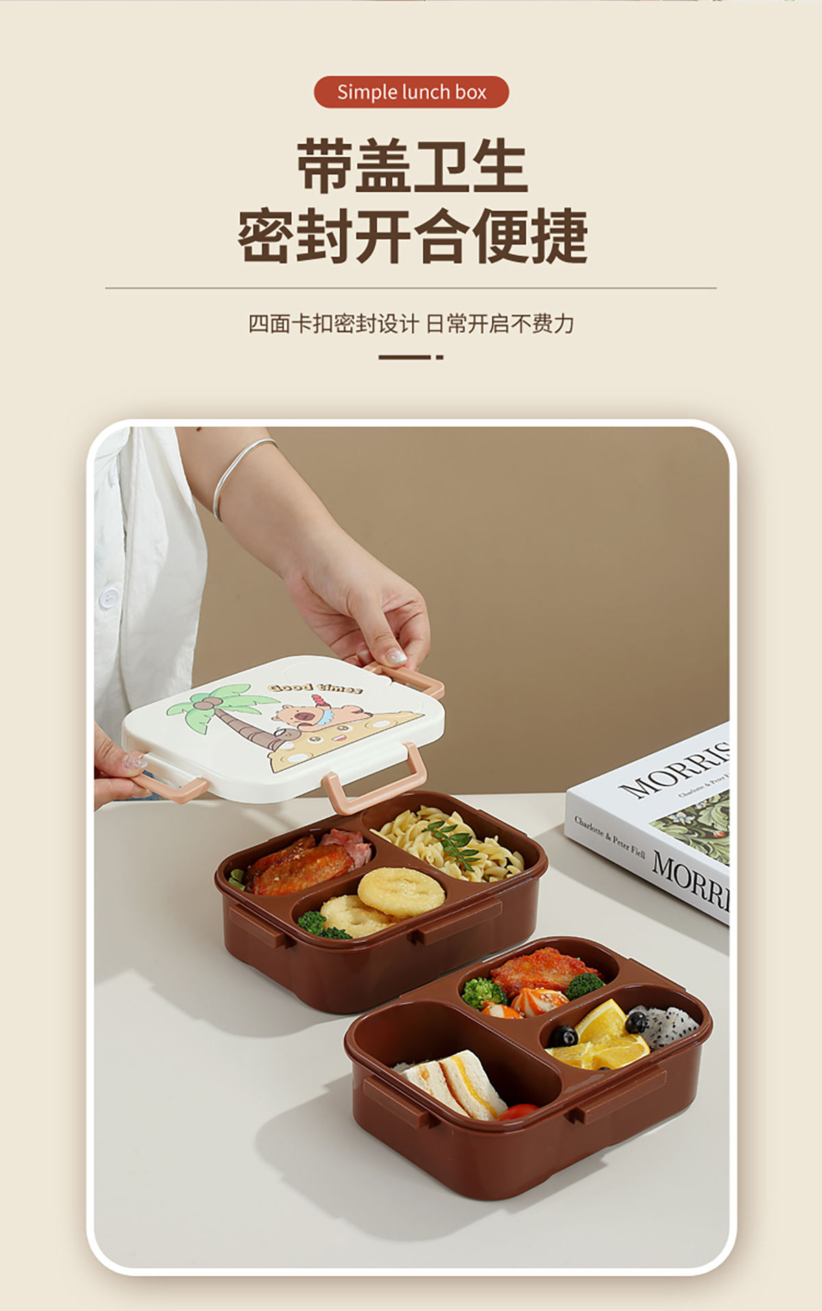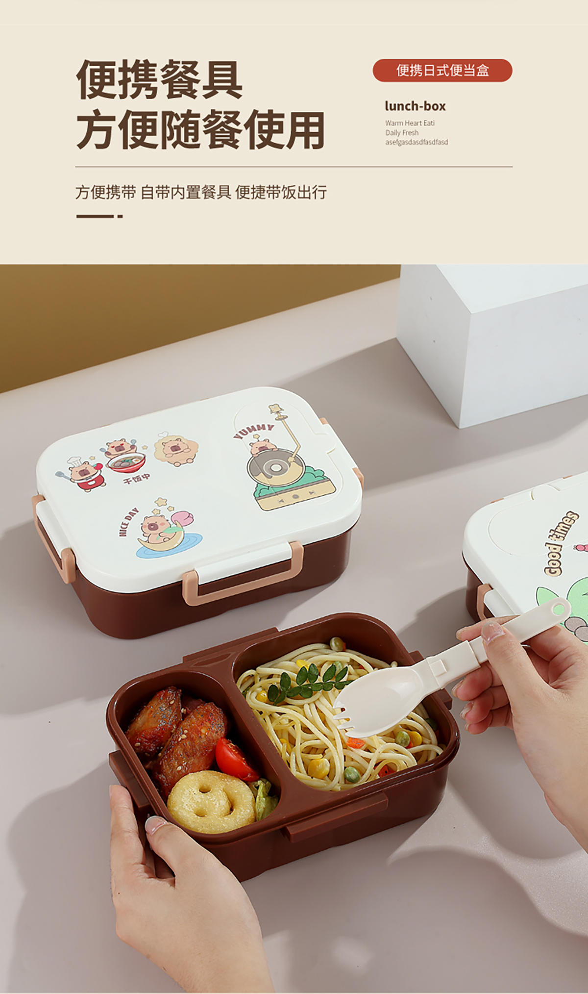 UV獨(dú)立密封卡皮家族塑料餐盒2格900ml/3格850ml (配PP折疊湯勺)