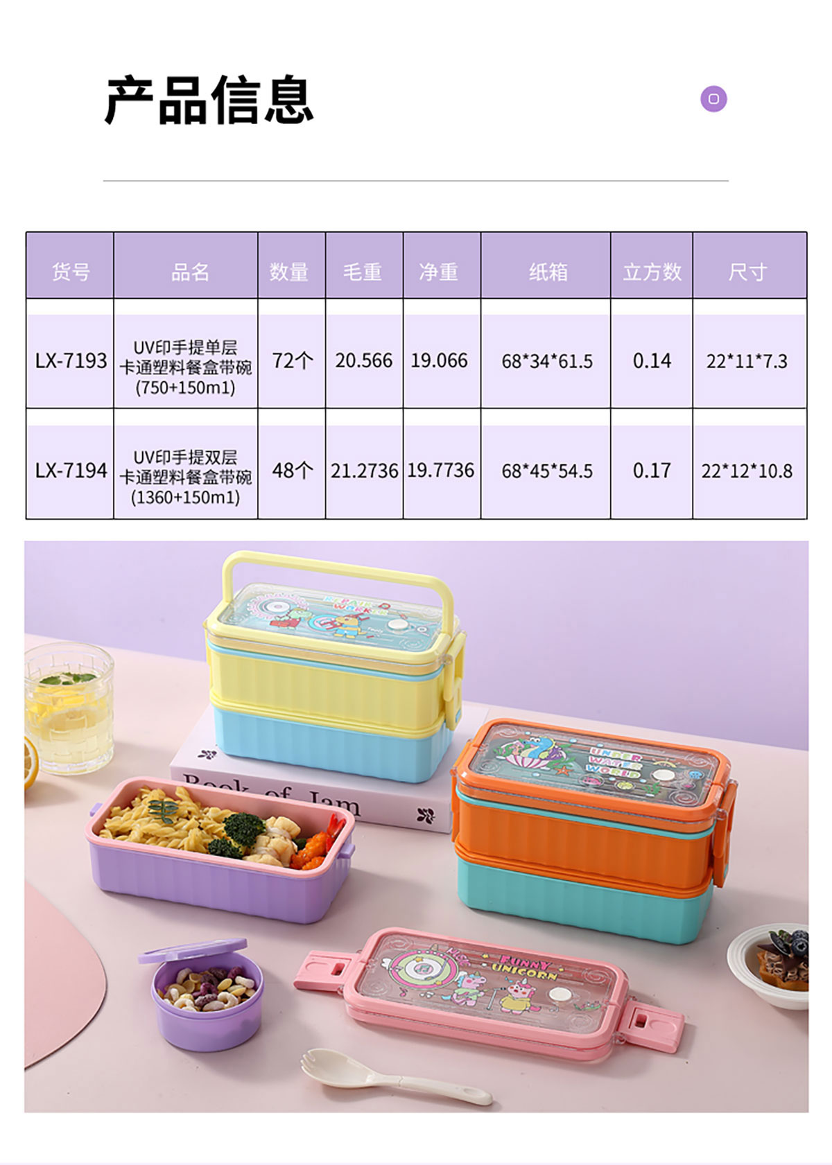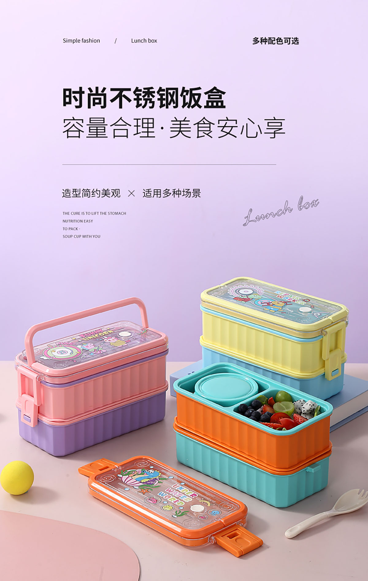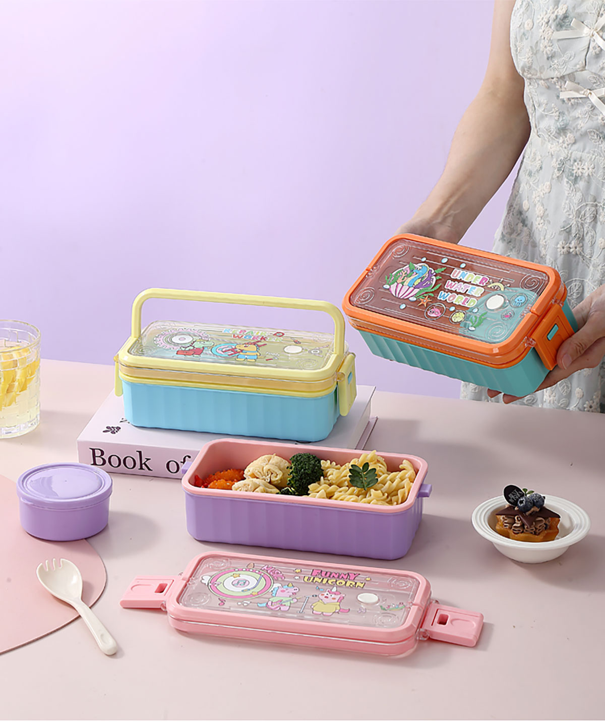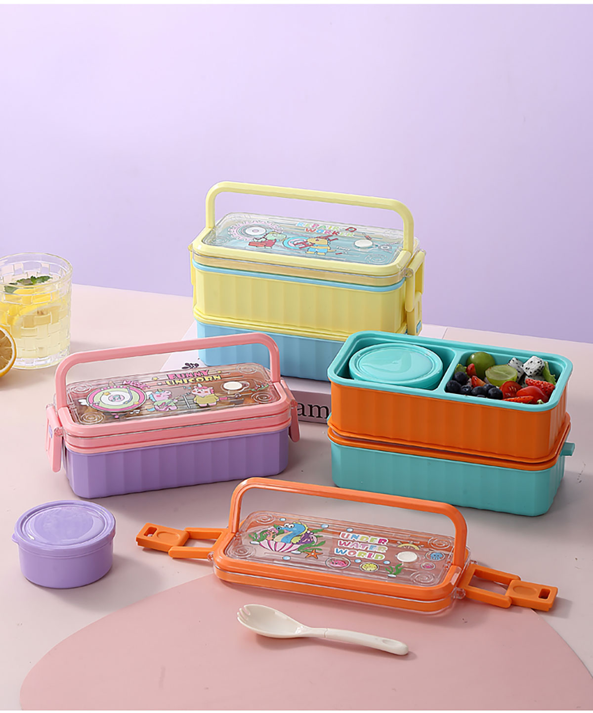 UV 手提單層/雙層卡通塑料餐盒(配PP叉勺+PP湯碗150ml)