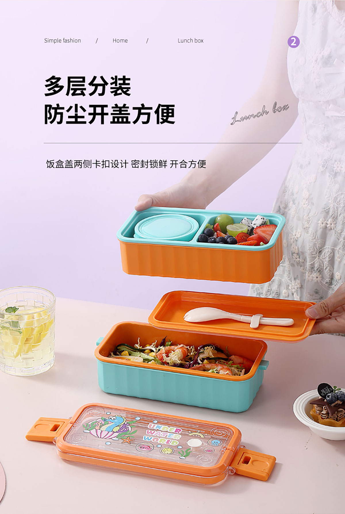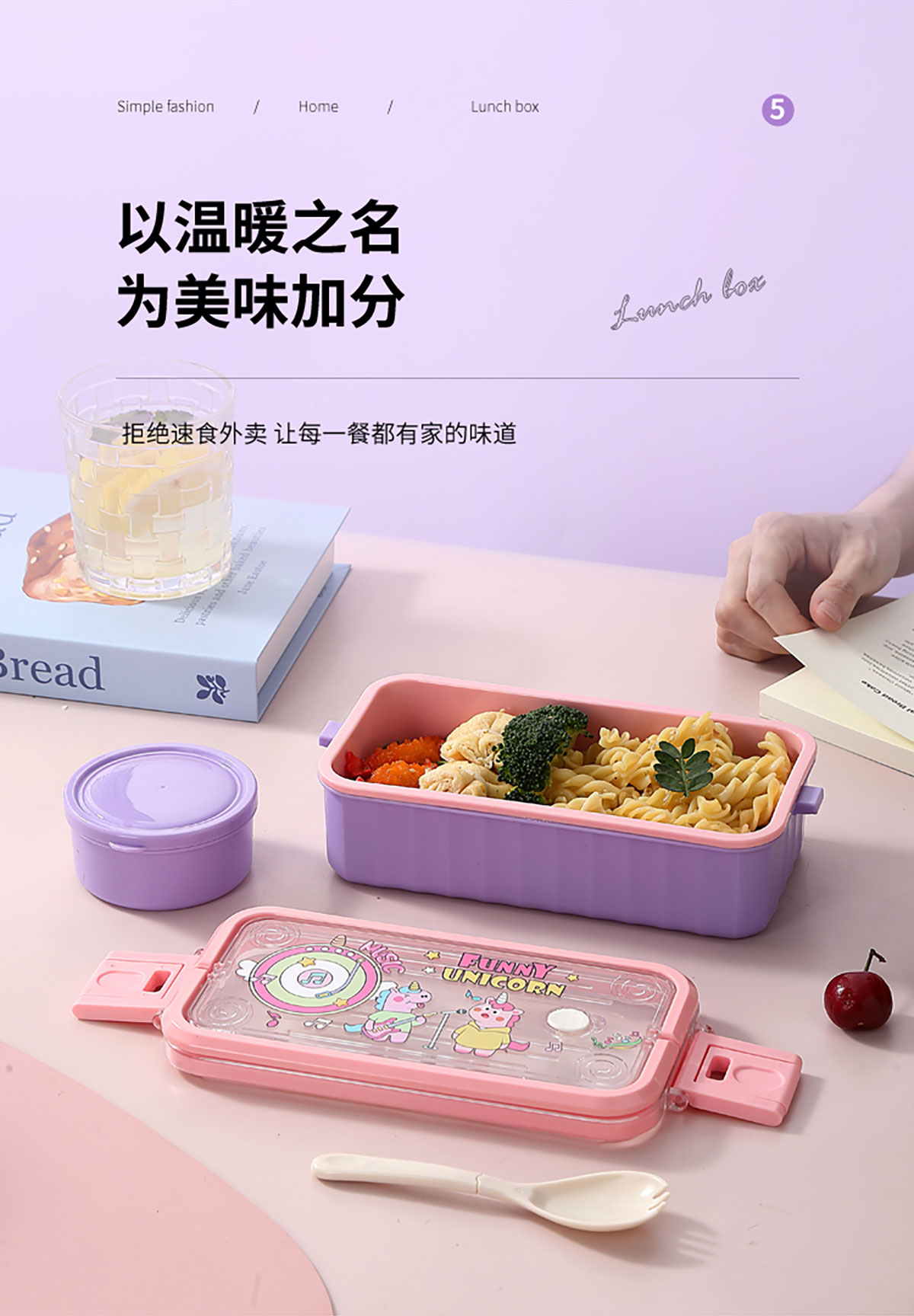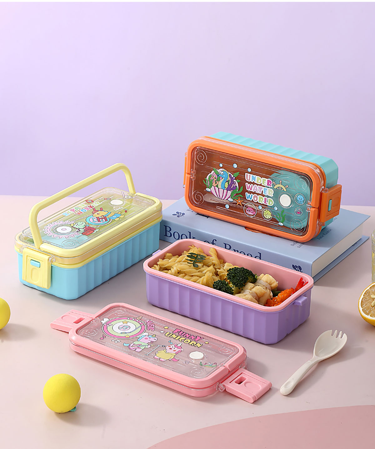 UV 手提單層/雙層卡通塑料餐盒(配PP叉勺+PP湯碗150ml)