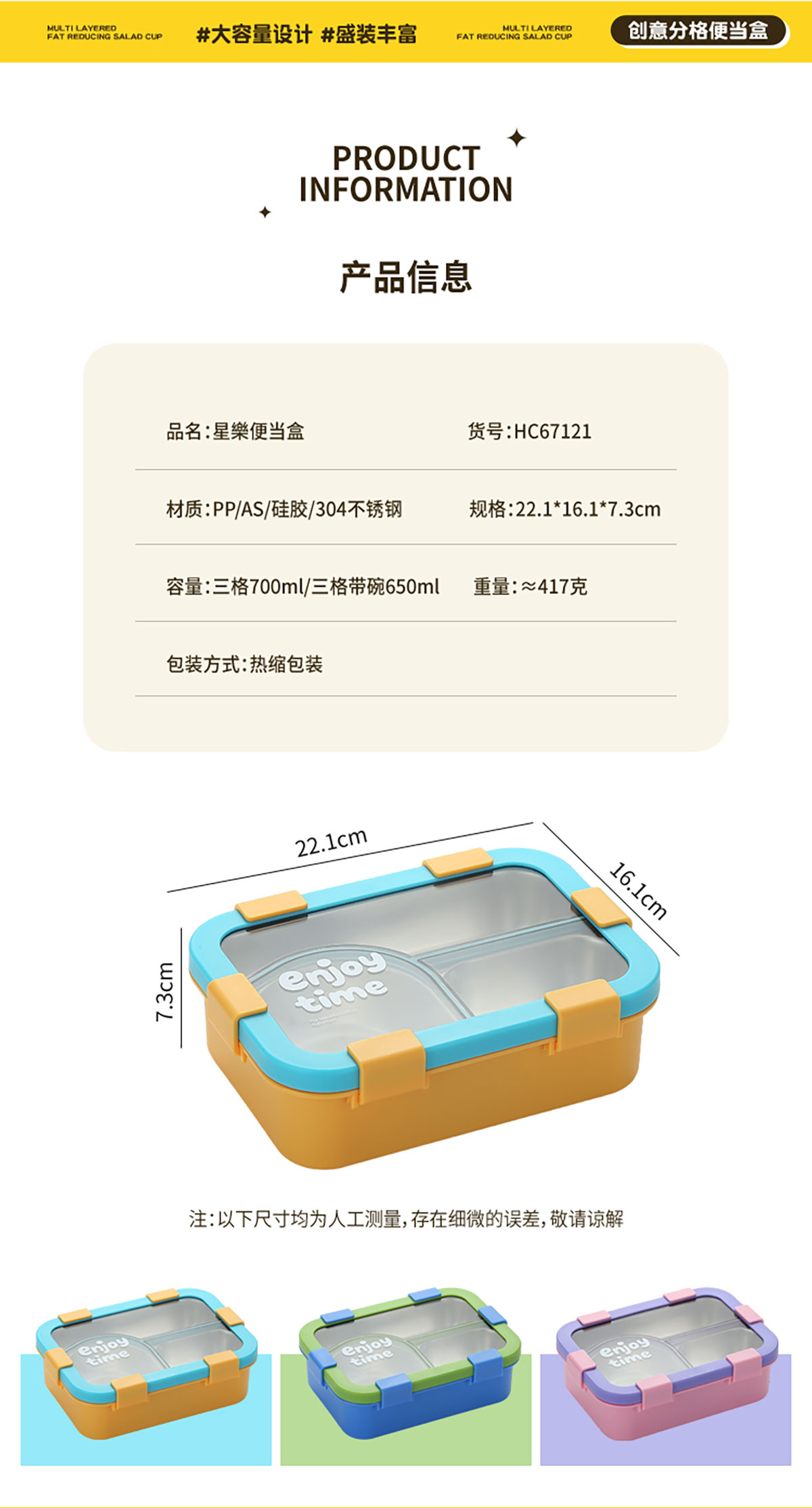 Size: 221*161*73mm(三格700ml/三格碗型650ml)